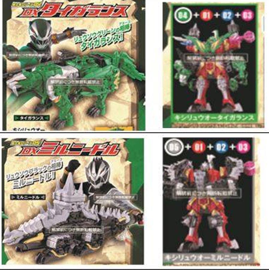 The Ryusougers mecha are called the Kishiryu (Dino Knights). RysuoRed mecha, Kishiryu-Oh is a standalone mecha similar to Ryuseioh or Go-Buster Ace. It will also feature the ability to combine with the other mechas using a LEGO-like block building system. When combining Blue’s Triken and Pink’s Ankiroze, Kishiryu-Oh become Kishiryu-Oh 3 Knights. However, when combining with either Green’s TigerLance or Black’s MilNeedle they will act as auxiliary limbs and weapons in conjunction to Kishiryu-Oh 3 Knights rather than entirely swapping them out. The combination between Kishiryu-Oh and TigerLance is called Kishiryu-Oh TigerLance. Whereas, MilNeedle allows the mecha to become Kishiryu-Oh MilNeedle.